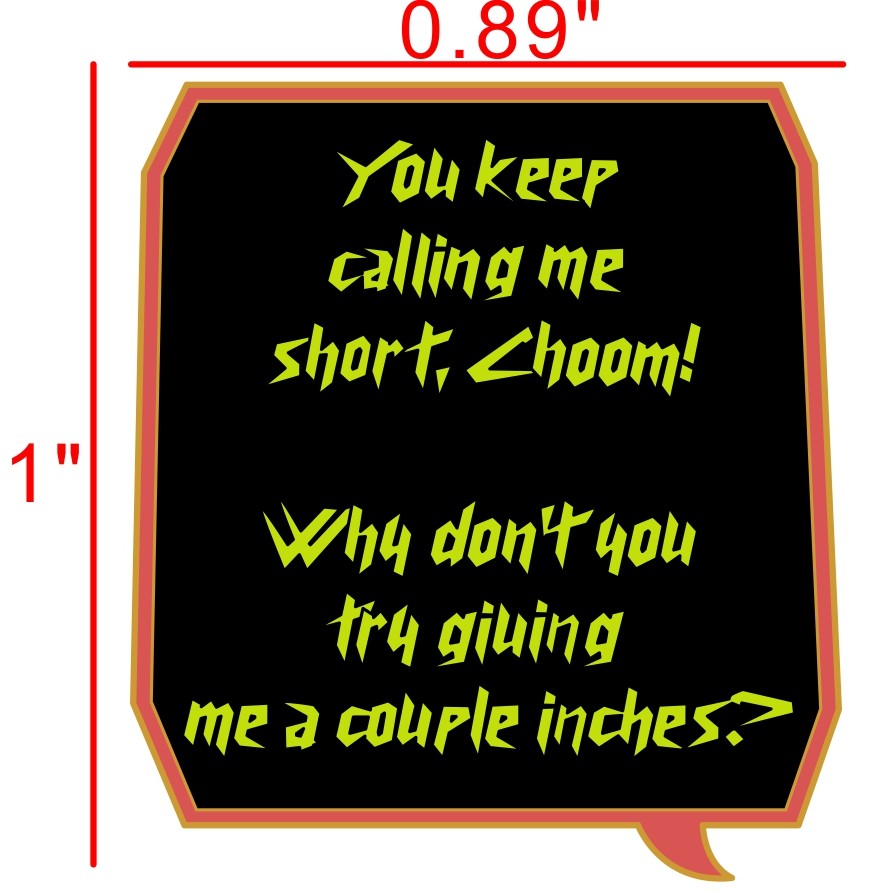Gold (LE 20): 3 inches tall, dual pronged, 6 enamel colors, 16 screen-print colors, glow in the dark speech bubble included